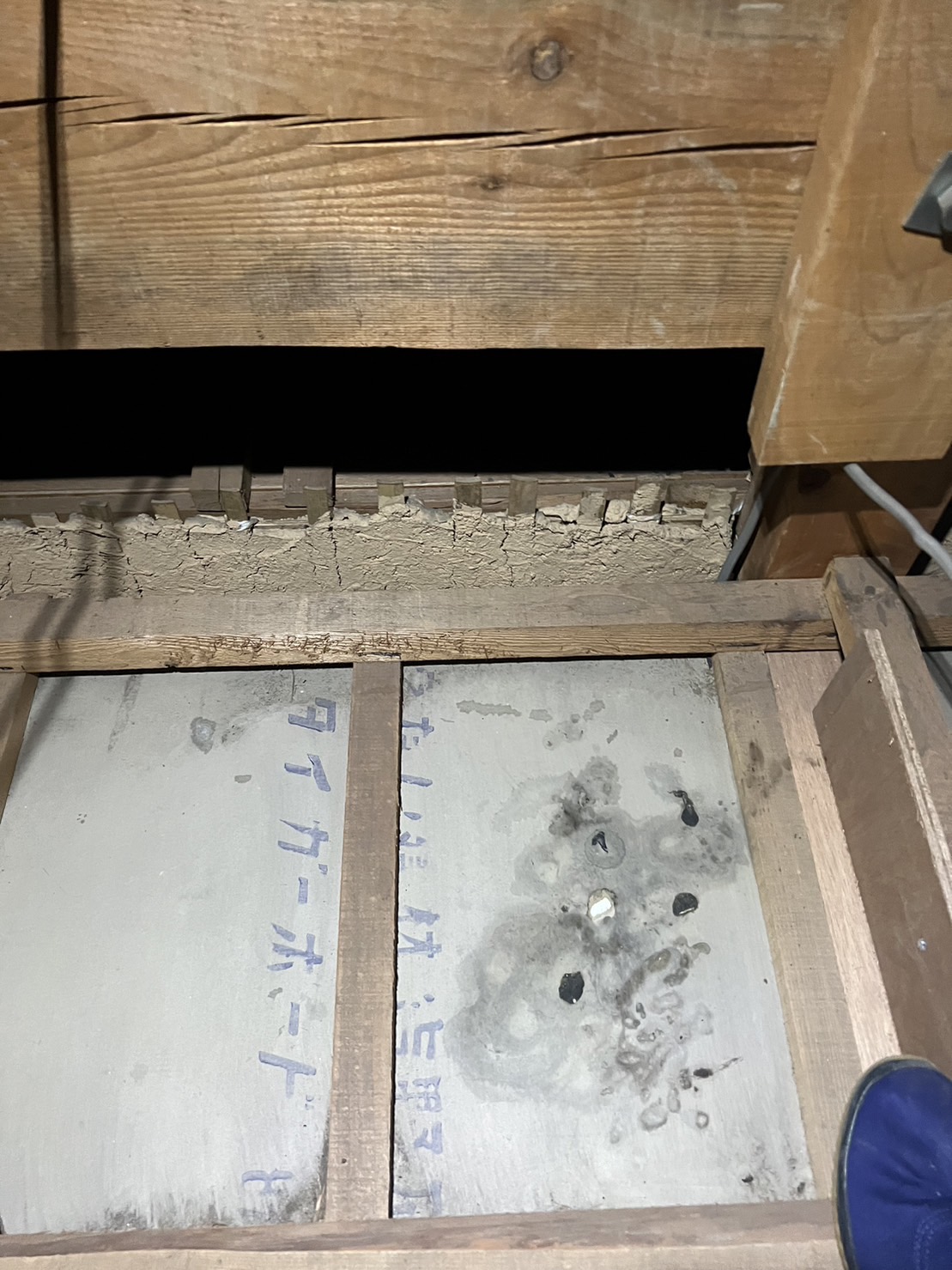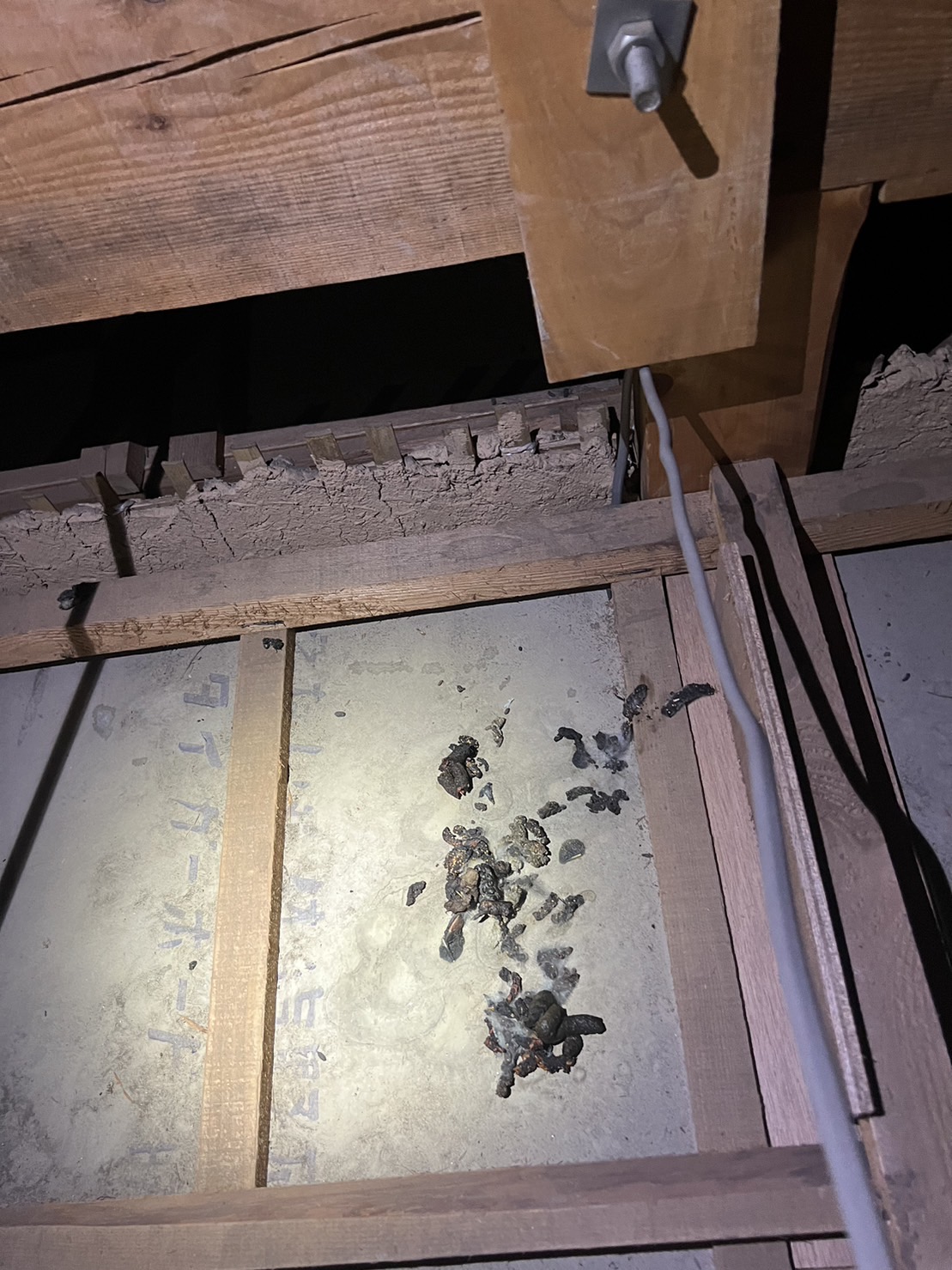 まずは、押し入れ点検口より屋根裏の隅々までチェックをし、糞清掃を行いました。