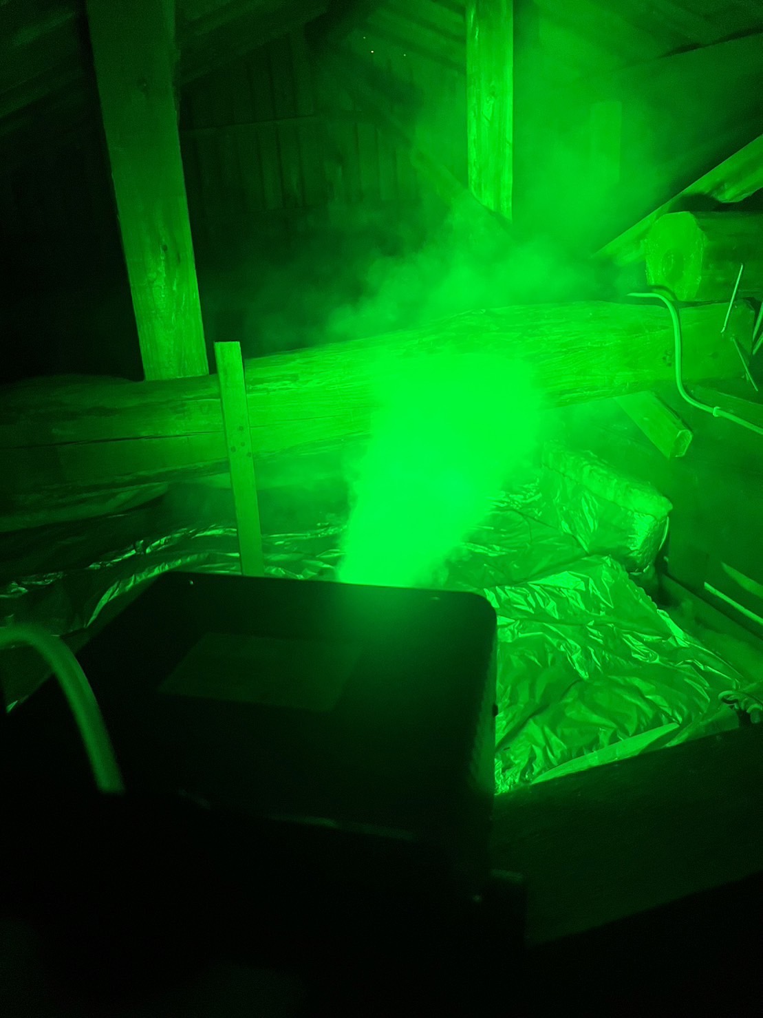 2日目は最初に、追い出し作業を行いました。追い出し作業とは、動物が嫌がる臭いや薬剤を専用の機械に入れて、煙状にして天井裏や床下に煙を充満させる作業となります。