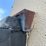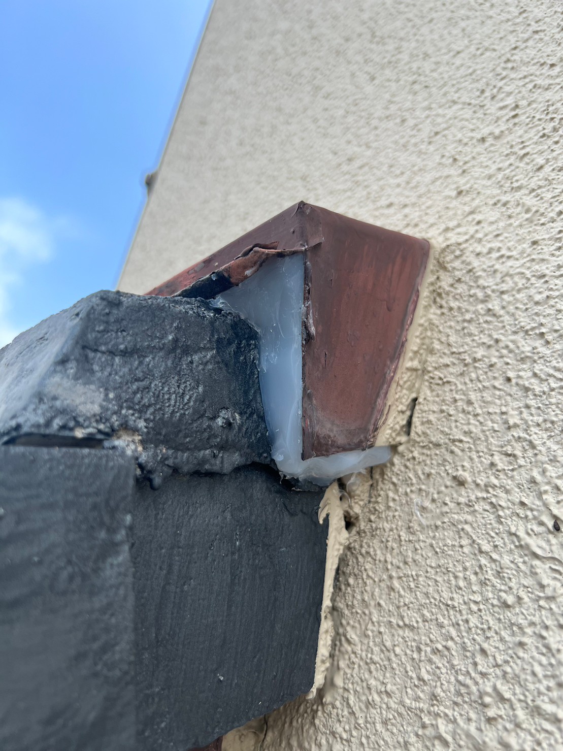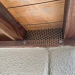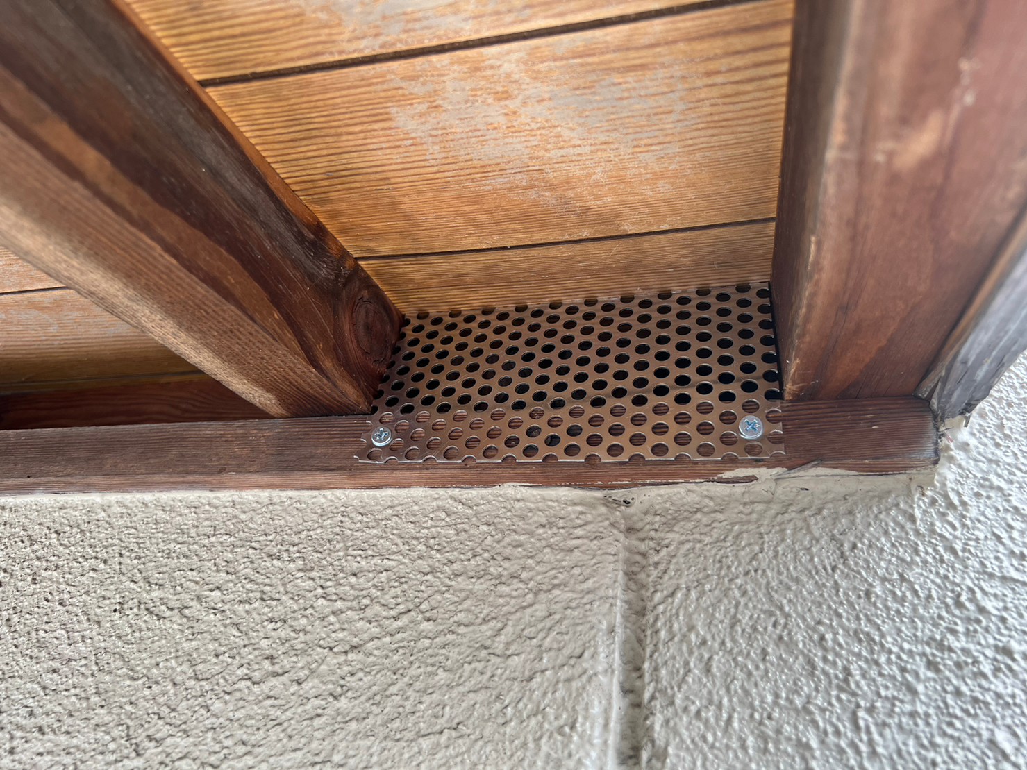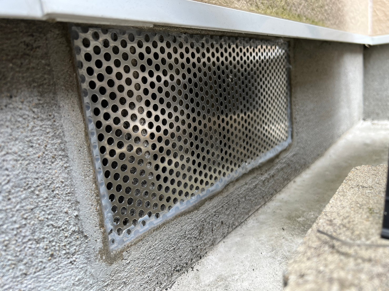 床下通風口はパンチングメタルで縁をクリアーのコーキングで塞ぎました。瓦の上に上がってハリ上の三角形の隙間をクリアーのコーキングで塞いだ後、玄関面上のかまぼこ1ヶ所が空いていたのでパンチングメタルとビスで塞ぎ完工となりました。