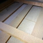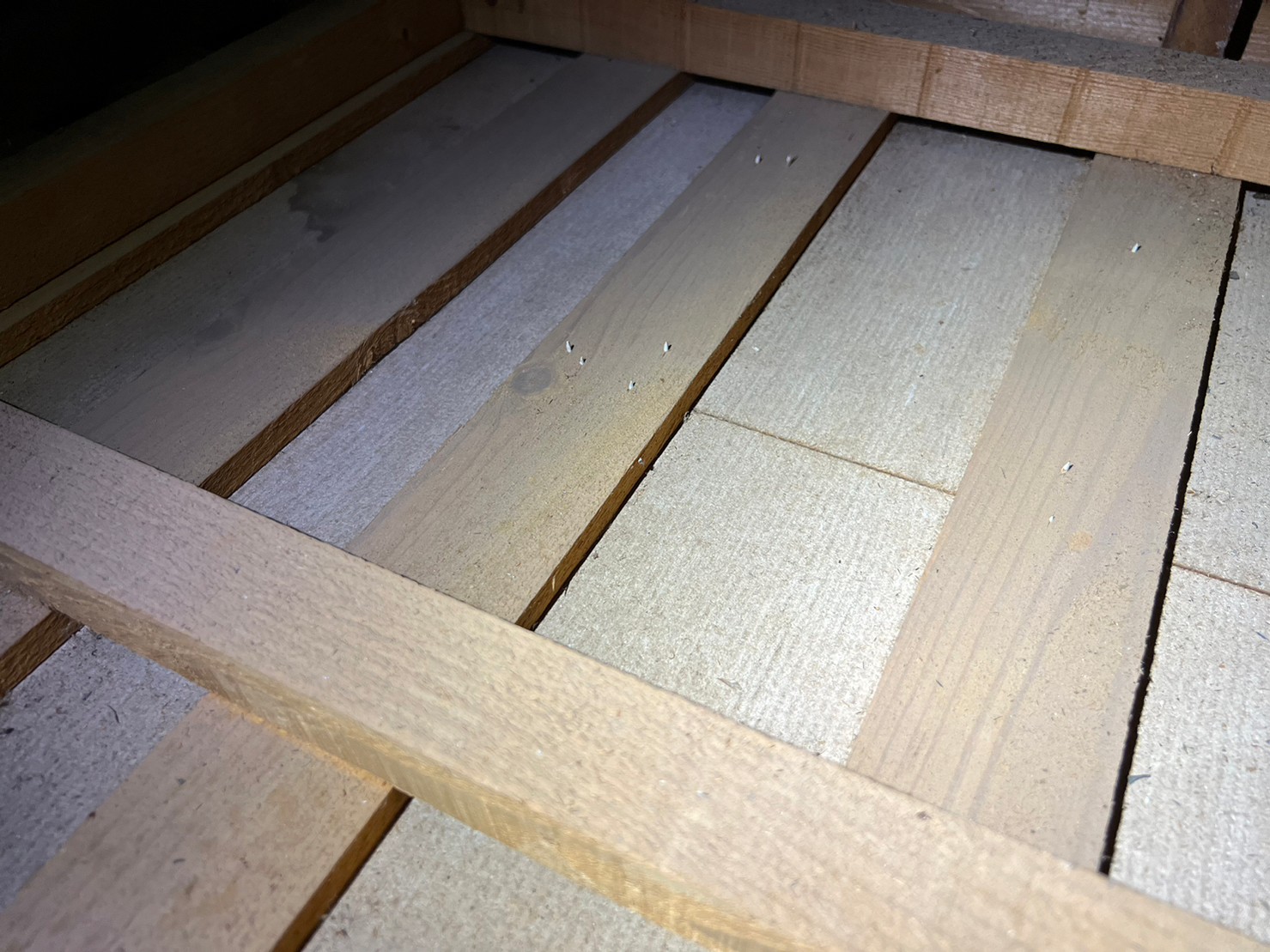 初めに1階の点検口を開口しました。その後2階の点検口から屋根裏に入り糞清掃と追い出し作業をしました。その際に壁の中からコウモリの這う音が聞こえた為すぐに動物の確認が容易でした。侵入口は2階の瓦と外壁の隙間でした。軒下にコウモリの尿と糞害によるシミができておりその真下の瓦の上には糞がまとまって落ちていました。