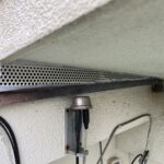 断熱材の隙間や内壁に糞と尿による被害が酷く臭いもありました。入ってすぐにコウモリを2匹確認し糞清掃後追い出し作業にはいりました。室内作業が終わり外部侵入口封鎖工事に取り掛かり外のパイプ状の通気口をパンチングメタルとクリアコーキングで塞ぎ板金屋根と外壁の隙間にはクリアのコーキングでしっかり塞ぎ完工となりました。