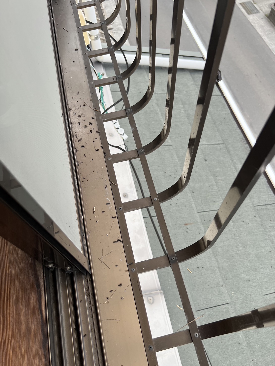 K様では特に2階のシャッター4箇所に被害が酷く、糞もたくさんありました。コウモリの糞は他の動物と違い危険性が高いです。潰れると粉になる特徴がありそれらが体内に入ると感染症を引き起こす危険性があります。