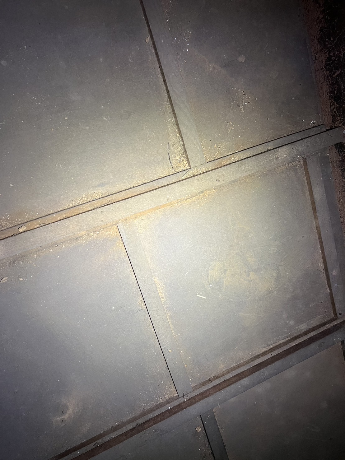 1階天井裏ではコウモリの糞とネズミの糞が所々散らばった状況でしたので、塵取りを使用してしっかり清掃させて頂きました。