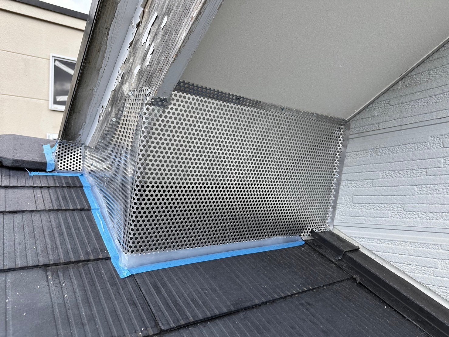 屋根上に大きな穴があったため、自社で取り扱っている、通気が取れる板金板でテンに壊されないようしっかりとした強度がある封鎖工事を行いました。