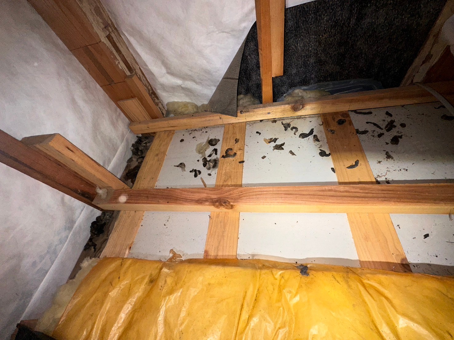 まず初めに1階2階の点検口から天井裏に入り、糞清掃を行いました。